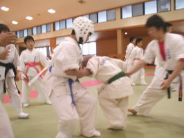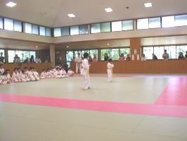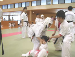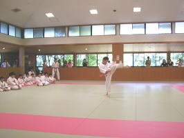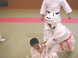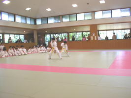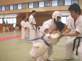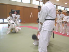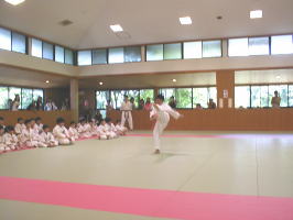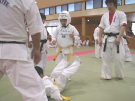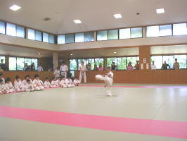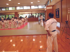 型の後、すぐに少年部のサバキがスタート。少年部のサバキは防具をつけて怪我の無いようにして行ないました。一人ずつ前に出て連続して行なうのは一般部も少年部も同じです。