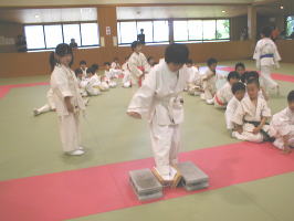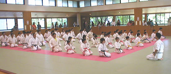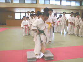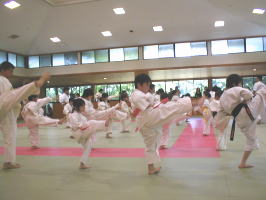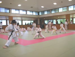 基本の次に少年部全体で型の稽古を行ないました。白帯・橙帯グループは初心の型を青帯〜黒帯は帯色に応じた組手の型です。全体で型の稽古を行なった後には、少年部代表者による型の演武も行ないました。 |
