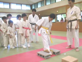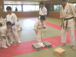 サバキ稽古を終えた後、試し割りに挑戦。足刀や正拳・手刀で板を次々に割っていました。少年部の稽古はここで終了。