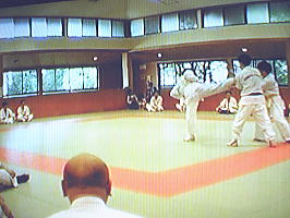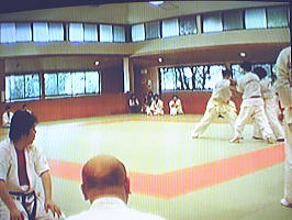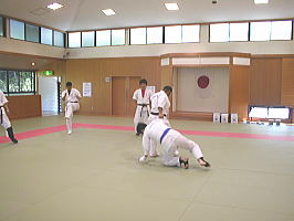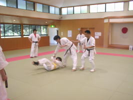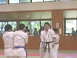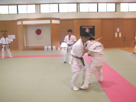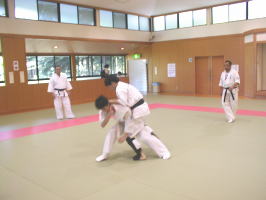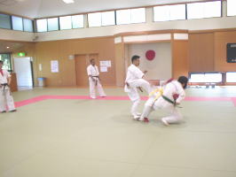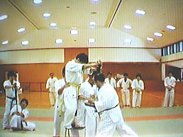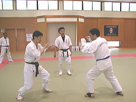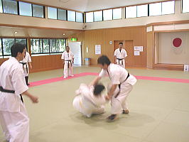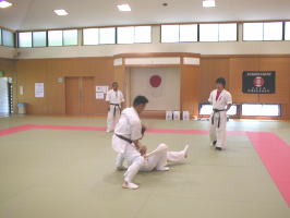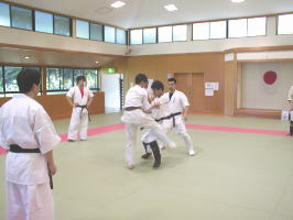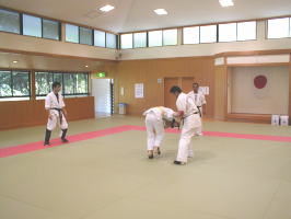 黒帯から青帯まで順番に1名ずつ前に出て全力で攻撃を繰り出す他の色帯の攻撃を次々に捌いていきます。黒帯・色帯全員がサバキにチャレンジ。希望者のみでしたが白帯も前に出てサバキを行ないました。 |