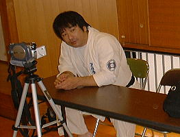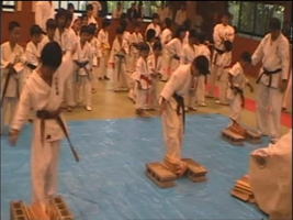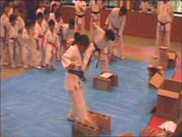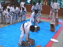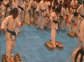 サバキ稽古を終えた後、試し割りに挑戦。足刀や正拳・手刀で板を次々に割っていました。少年部の稽古はここで終了。最後の写真は少年部の稽古終了を告げる矢野支部長。