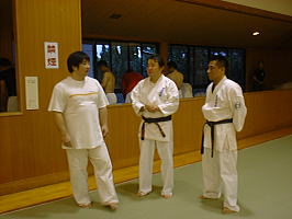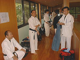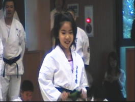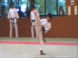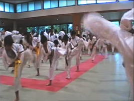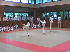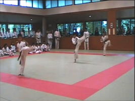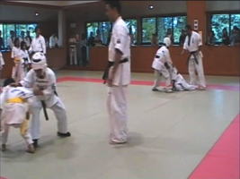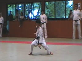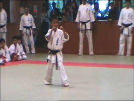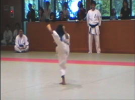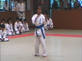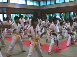基本の後は、帯の色ごとに指定の型を行います。そして色帯の中から代表者が1人ずつ型を披露しました。 |