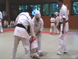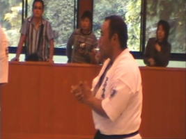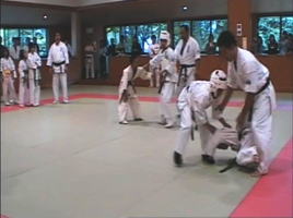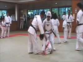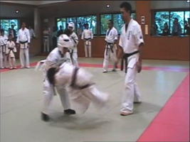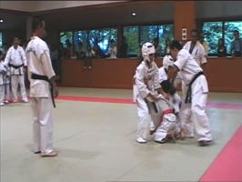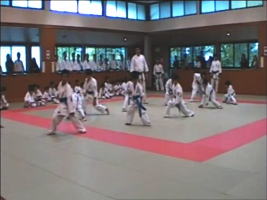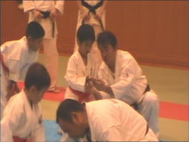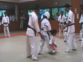 型の後、すぐに少年部のサバキがスタート。少年部のサバキは防具をつけて怪我の無いようにして行ないました。一人ずつ前に出て連続して行なうのは一般部も少年部も同じです。