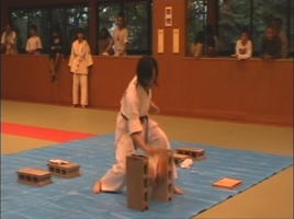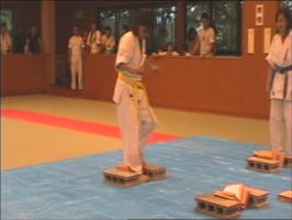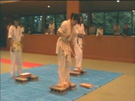 岸師範特別稽古の後で、バット折や板割りの演武を行いました。最後の締めは釣鐘式頭割りという荒業でした。