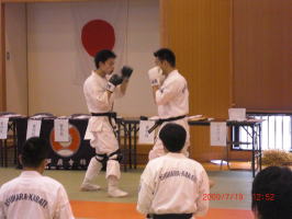 兼松二段と涌井初段によるグローブを着用してのテクニックの実演です。このお二人の動きを見て参加者は各自練習にとりかかります。