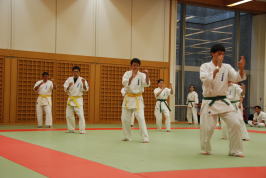 審査の最初の科目は基本です。 トップバッターは白帯と橙帯少年部。その後に青帯、黄帯、緑帯、茶帯と続きます。