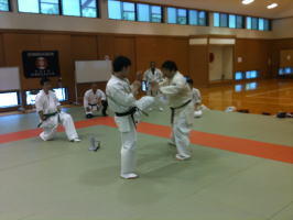 関西本部門下生の実演による「基本の型2」の技の説明です。岸師範が実際の攻防テクニックとしての技のポイントを解説してくださいました。 |