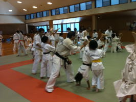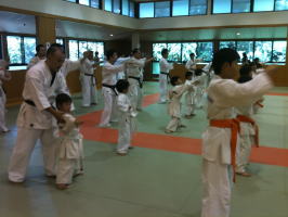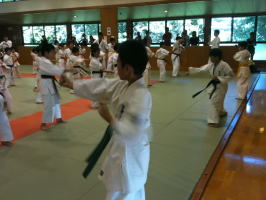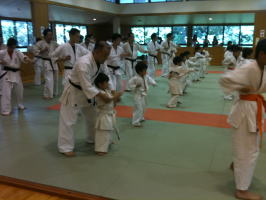 一般部の合同稽古の終了後、少年部の稽古がはじまりました。まず始めに矢野支部長と岸師範の挨拶の後、一般部と少年部合同で基本稽古を行いました。