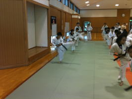 蹴り技に移る前に、柔軟運動を行いました。 |