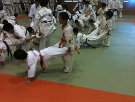 足技の号令も少年部自らが掛けます。この大人数を前にして大きな声を出して稽古を引っ張るのは、小学生にとっては大変なことです。 |
