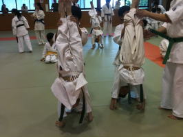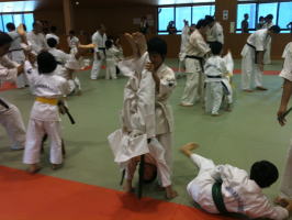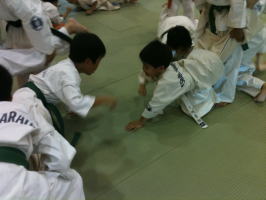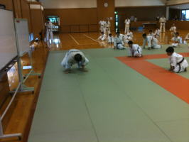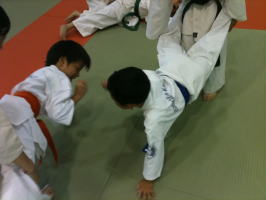 基本稽古の後、まずは体力つけるトレーニングです。いわゆる「手押し車」をゲーム感覚で楽しく行いました。 |