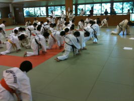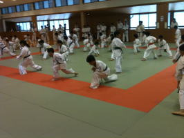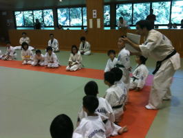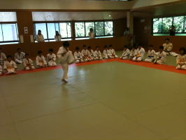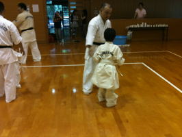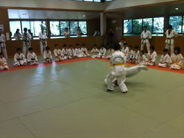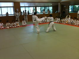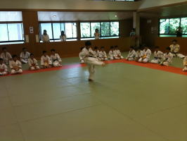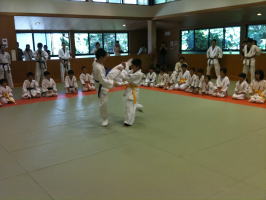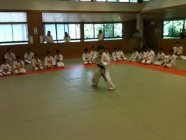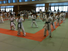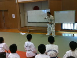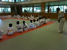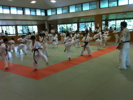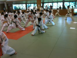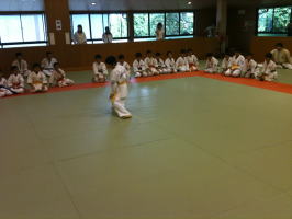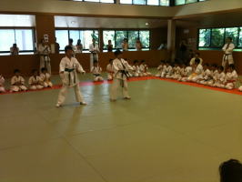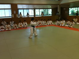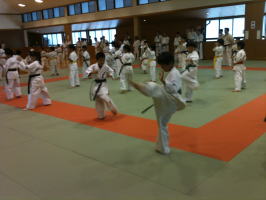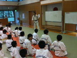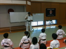 今度は春に開催された関西地区の少年部育成演武会での型の優勝者の型の演武を皆で見学しました。さすがはチャンピオン達とあって見事な型を披露してくれました。 |