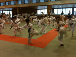 少年部の合同稽古では、型の稽古も行いました。まずは全員で各自が得意の型を行いました。