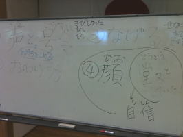 ホワイトボードやスケッチブックを活用しての型演武のポイント解説。一方的に教えるのではなく、子供自身にも考えさせて皆の前で発表させます。 |