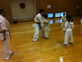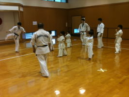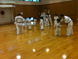 型をまだ覚えていない白帯は、別グループで初心の型1を教えてもらいました。指導するのは奈良支部長、深江橋支部長、関西本部指導員の皆さんです。 |