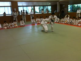 型の次は、同じく春に行われた少年部育成演武大会の二人一組で行う「サバキ演武」のチャンピオン達に実演してもらいました。本当に素晴らしいお手本となりました。 |