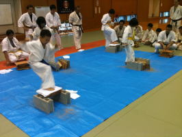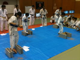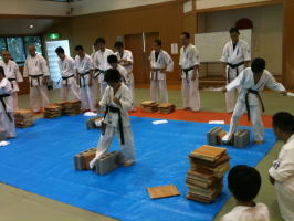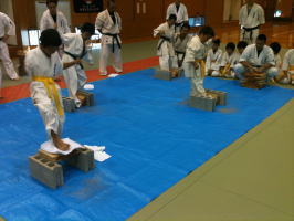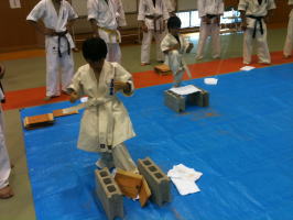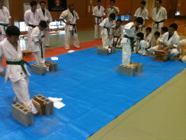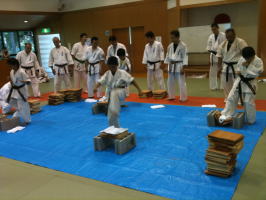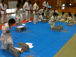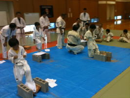合同稽古の最後のメニューとなった試し割です。自己申告の枚数の板を割っていきます。中には5枚、6枚と割っていく子供も現れました。 |