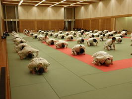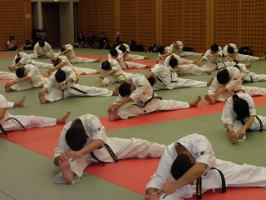 館長ご自身の指揮で、柔軟から基本稽古を行います。。 |