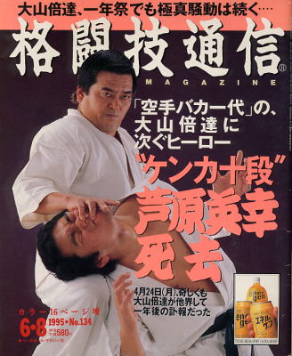 先代の訃報が格闘技界に流れた1995年4月、その直後の格闘技通信。巻頭カラーページで先代の葬儀の模様が特集された。石井和義氏の追悼インタビューも掲載。