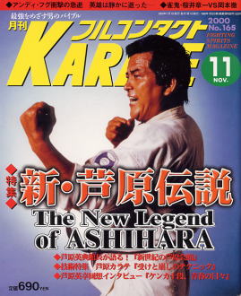 | 月刊フルコンタクトKARATE誌の2000年11月号で巻頭特集。巻頭カラーページでデンマークで開催された欧州合同稽古の模様を掲載。ヨーロッパの20カ国以上の国の支部長クラスの門下生約200名を前にして、芦原英典館長が指導されている。 館長のインタビューでは、英典館長が新世紀の芦原会館のあり方について、支部長インタビューでは、田園調布支部、倉敷支部、広島支部、伊予支部、埼玉航空自衛隊支部の各支部長が、現館長そして先代の印象について、また芦原会館発展のための決意を述べられている。 技術特集では、英典館長による誌上講習会として「ヒッカケ」を解説。「ヒッカケ」をもちいた多彩なサバキ・バリエーションを紹介している。 回想インタビューでは、加藤重夫氏、大沢昇氏、棟田利幸氏、片井祥雲氏、田原春統氏が、先代との思い出について語られている。 |