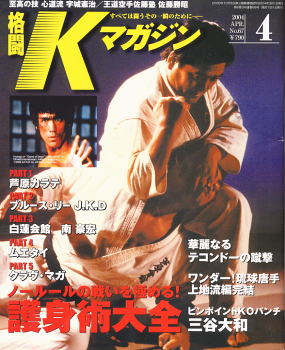 | 格闘Kマガジン誌2004年4月号の巻頭特集「護身術大全 ノールールの戦いを極める!」の中で「実戦!芦原カラテ 誰にでもできる空手 護身術編」をカラーページで掲載。 この特集記事は、芦原会館東京本部 西山亨師範の監修により技術解説がなされており、この号で紹介されているテクニックは、稽古時のような組手構えからではなく、すべて自然体の状態からのサバキテクニックになっている。 まず最初に、基本の受け技を応用した、つかみに来る相手に対する護身のテクニックの解説、次に、つかまれた場合の対処法、さらに、狭いところでの身の護り方が、連続写真で丁寧に紹介されている。 |