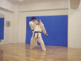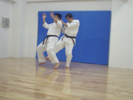 | 関西本部 岸保明師範のバックポジションを奪っての後頭部膝蹴り。 | ![]() |