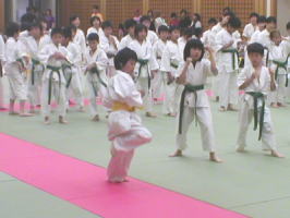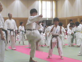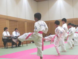 点呼を経て、いよいよ審査スタート。最初の科目は基本です。 トップバッターは白帯と橙帯少年部。元気いっぱいの気合が響きます。 |