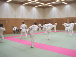 ■一般部審査 一般部は13:00に集合。各自審査に備えて体をほぐします。そして13:30に点呼。緊張が高まります。 |