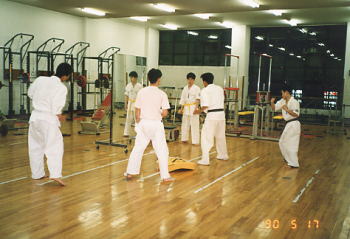 | 2回生の時の稽古風景。ちょくちょくOBのY先輩やA先輩、T先輩が稽古に参加されて、指導していただきました。皆さん強くて、格好よくて、やさしくて、憧れの存在でした。 稽古場所は各種ウェイトトレーニングマシンが取り揃えられたトレーニング室を使用していました。今振り返ると本当に恵まれた環境でした。もっと稽古しておけばと今になって悔やまれます。 |