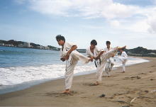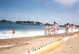 | 2回生の時の夏合宿は若狭。海岸でのトレーニングはランニングや基本稽古を行い、その後は海でのんびり遊びました。また体育館を借りての稽古はビッシリと…ではなく、やっぱりのんびりやったような気がします。 右の写真の中央でしゃがんでいる方が、当時の3回生でリーダーだったK山先輩。 |