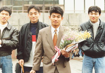 | この年の4回生の卒業式の日。前年度のリーダーとして同好会を引っ張っていただいたK山先輩。高校時代も柔道部の主将を務めた武道家。趣味はサーフィンでルックスも抜群、性格もやさしく温厚な先輩でした。 | ![]() |